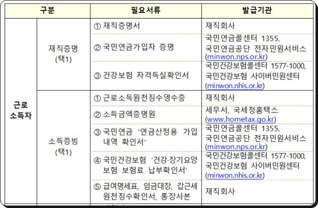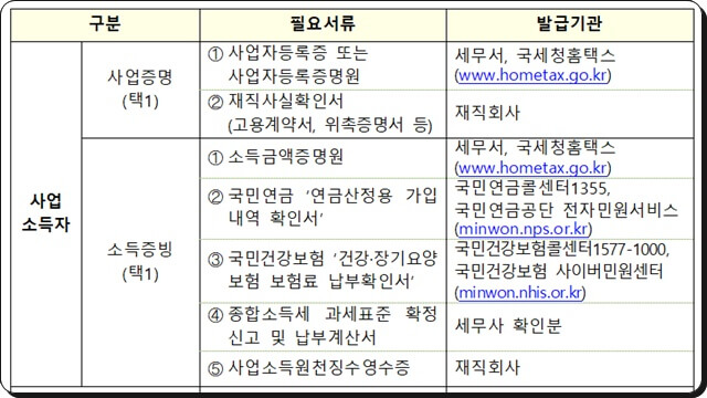 등록사업자, 미등록 사업자, 연금 소득자에 해당하시는 분들의 사업영위 증명 서류 및 소득 증빙서류는 다음을 참고하시기 바랍니다.